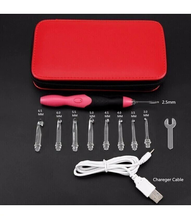 set agujas crochet, con punta carilica transparente para reflejar la luz, trae 9 puntas intercambiables, que van del número 2 al 6, viene en el estuche como se ve en la foto, con las herramientas para cambiar la punta y el cargador usb